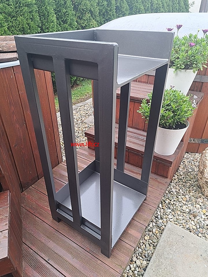 Koše s lamelovou konstrukcí: Tvořené svislými nebo vodorovnými kovovými lamelami, které vytvářejí dojem lehkosti a zároveň poskytují dřevu dostatečnou oporu.
